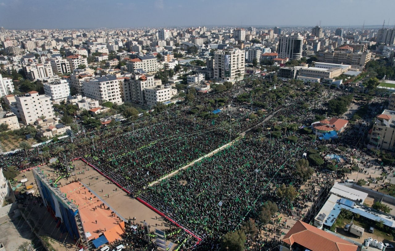 شهدت أرض الكتيبة في غزة زحفًا جماهيريًا ضخمًا كثيرَ العدد. الجماهير التي تدفقت كالموج الهادر المتجدد جاءت من جميع محافظات قطاع غزة، يحدوها شوق كبير للحضور وتجديد البيعة لحماس، وخيار المقاومة، وتهنئة القادة، والترحم على الشهداء.