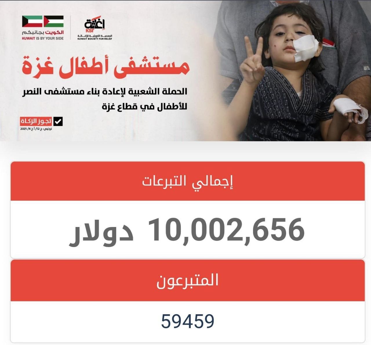 نجحت الحملة الشعبية التي أطلقتها الجمعية الكويتية للإغاثة بالتعاون مع وزارة الصحة الفلسطينية، وبتنفيذ ناشطين من غزة في جمع 10 ملايين دولار لإعادة بناء مستشفى النصر للأطفال بمدينة غزة.