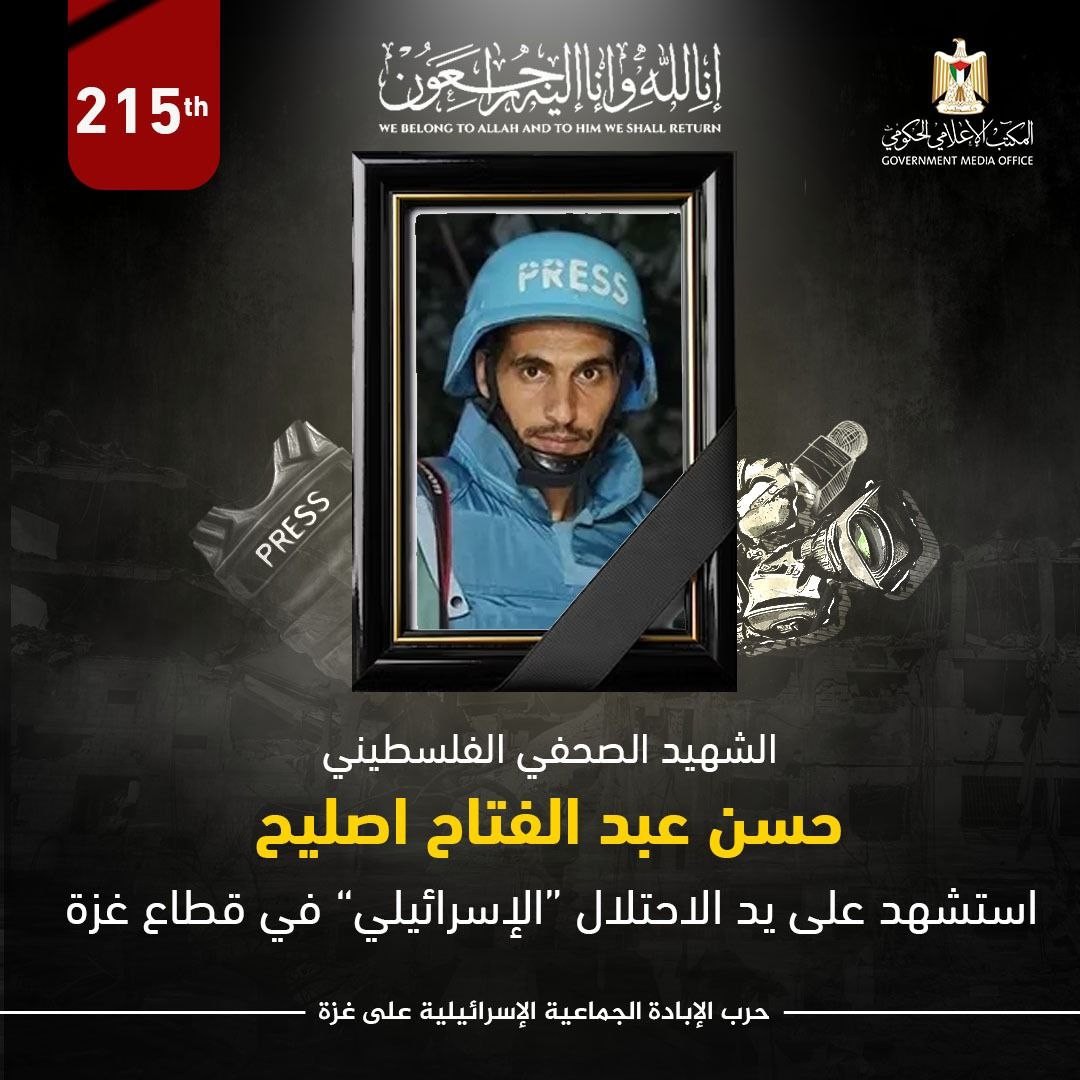 و أوضحت الحركة انه باستشهاد الصحفي البطل حسن اصليح، يرتفع عدد شهداء الأسرة الصحفية الفلسطينية إلى (215 صحفياً) منذ بدء العدوان الصهيوني الإجرامي على قطاع غزة، في حصيلة تعكس حجم الاستهداف الممنهج والمتعمد للإعلام الفلسطيني، ضمن محاولات الاحتلال البائسة لكتم الحقيقة وكسر إرادة شعبنا الصامد.