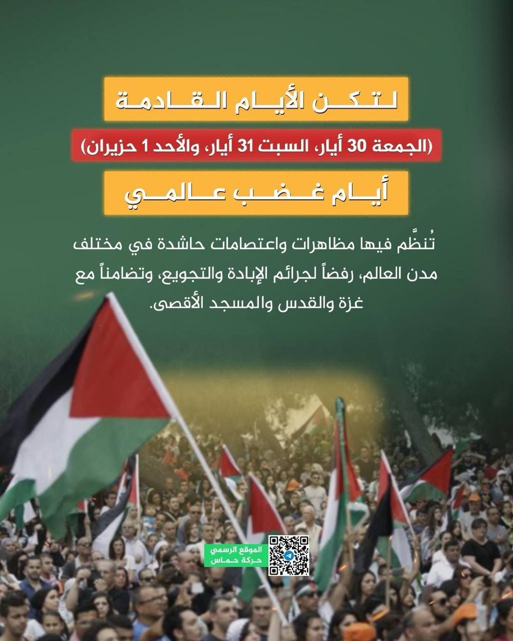 وحدّدت الحركة أيام الجمعة والسبت والأحد، 30 و31 أيار/مايو، و1 حزيران/يونيو، لتكون أيام غضب عالمي، تتخللها مظاهرات ومسيرات واعتصامات جماهيرية حاشدة.