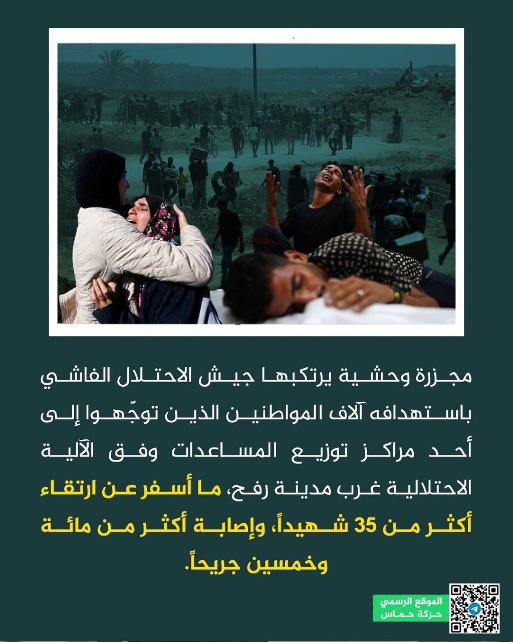 قالت حركة المقاومة الإسلامية "حماس" إن جيش الاحتلال الصهيوني ارتكب مجزرة وحشية، فجر اليوم الأحد، باستهدافه آلاف المواطنين الذين توجّهوا إلى أحد مراكز توزيع المساعدات وفق "الآلية الاحتلالية" غرب مدينة رفح، ما أدى إلى استشهاد أكثر من 35 مواطنًا، وإصابة أكثر من 150 آخرين بجروح متفاوتة.