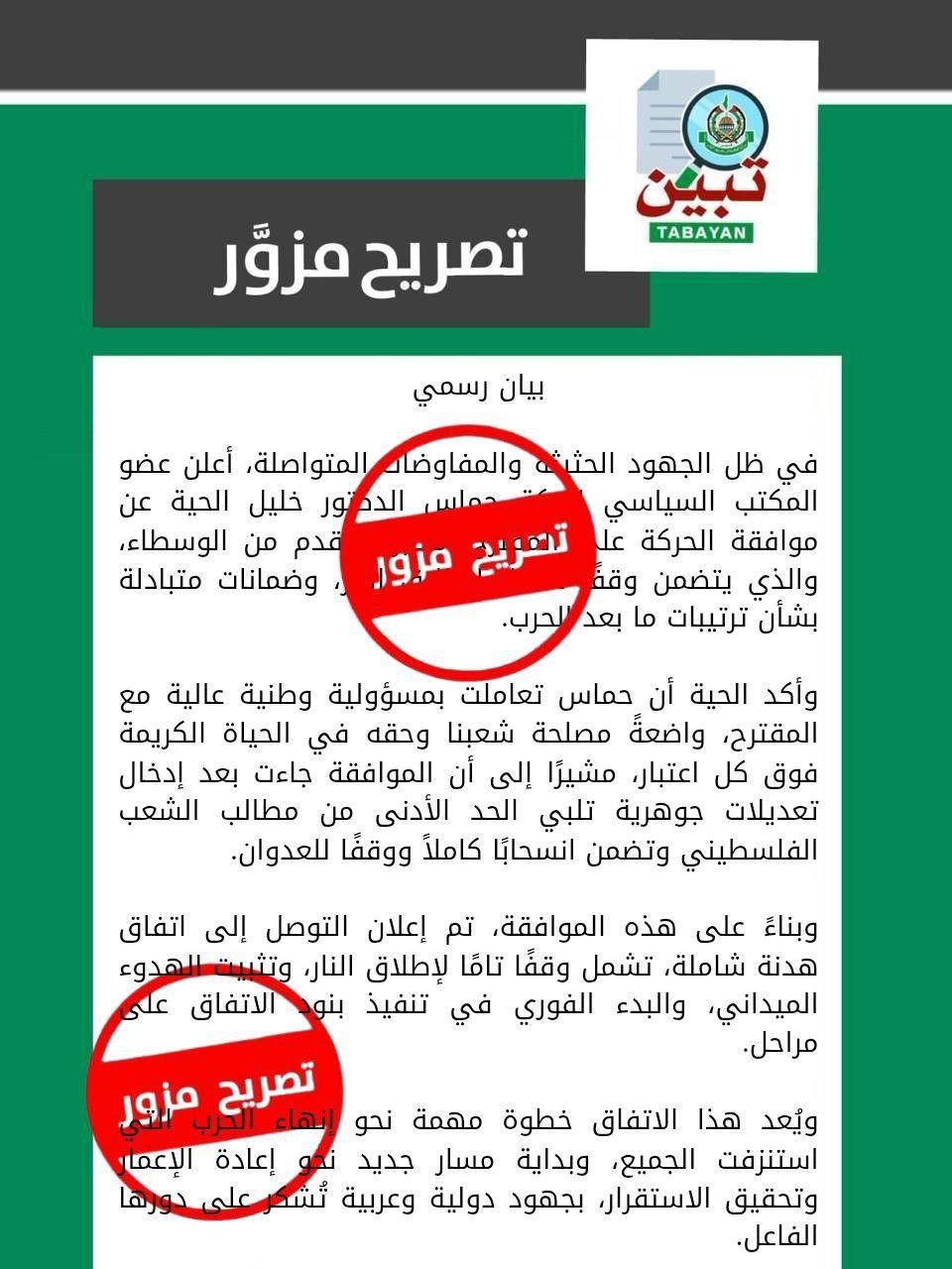 وفي السياق ذاته، نفت حركة حماس صحة بيان مزعوم يتم تداوله على مواقع التواصل الاجتماعي، ونُسب زورًا إلى رئيس الحركة في قطاع غزة ورئيس الوفد المفاوض الدكتور خليل الحية، مؤكدة أنه بيان مزور ولا أساس له من الصحة.