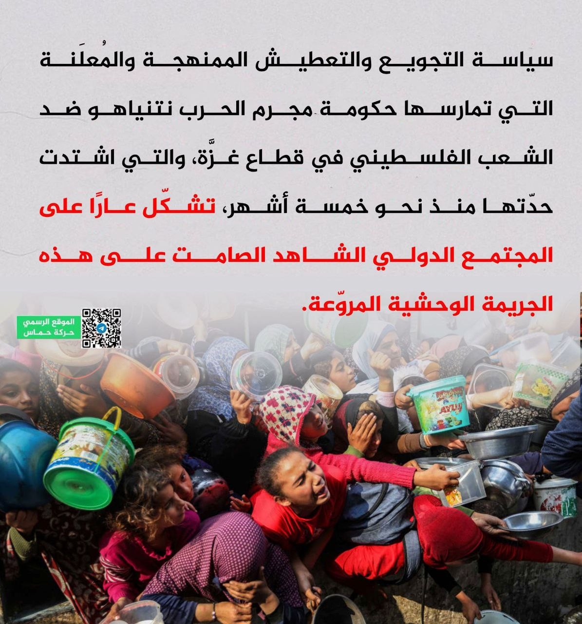 أدانت حركة المقاومة الإسلامية – حماس استمرار جريمة التجويع الممنهجة التي يتعرض لها الشعب الفلسطيني في قطاع غزة، ووصفتها بأنها واحدة من أفظع جرائم العصر، في ظل صمت دولي مخزٍ وتواطؤ واضح من قِبل القوى الكبرى.