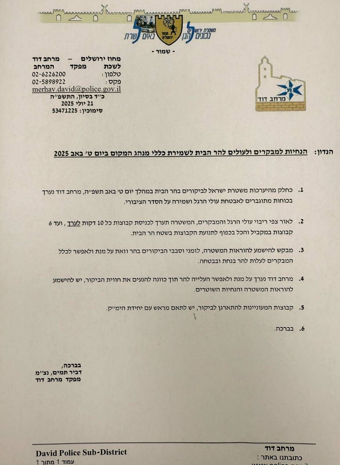 وفي رسالة رسمية بعث بها قائد منطقة البلدة القديمة لدى شرطة الاحتلال، المقدم دفير تميم، تعهدت الشرطة بتوفير كافة التسهيلات اللازمة لتنظيم الاقتحام الجماعي، معلنةً عن جدول يسمح بإدخال فوج من المستوطنين المقتحمين كل 10 دقائق، وبواقع ستة أفواج متزامنة داخل الأقصى في اللحظة الواحدة.
